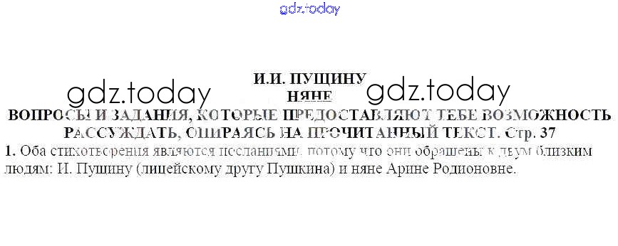 На страницах сайта gdz.today вы найдете учебный и вспомогательный материал, направленный на улучшения знаний школьной программы. ГДЗ - онлайн мир знаний Вопросы и задания, которые дают тебе возможность рассуждать, опираясь на прочитанный текст (стр. 37) И.И. Пущину. Няне 1 Учебнику по Литературе для 5 класса Москвин Вентана-граф Алгоритм успеха 2020