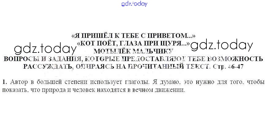 На страницах сайта gdz.today вы найдете учебный и вспомогательный материал, направленный на улучшения знаний школьной программы. ГДЗ - онлайн мир знаний Вопросы и задания, которые дают тебе возможность рассуждать, опираясь на прочитанный текст (стр. 46-47) Я пришёл к тебе с приветом... Кот поёт, глаза при щуря. Мотылёк мальчику 1 Учебнику по Литературе для 5 класса Москвин Вентана-граф Алгоритм успеха 2020
