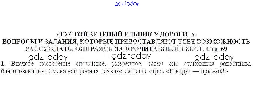 На страницах сайта gdz.today вы найдете учебный и вспомогательный материал, направленный на улучшения знаний школьной программы. ГДЗ - онлайн мир знаний Вопросы и задания, которые дают тебе возможность рассуждать, опираясь на прочитанный текст (стр. 69) Густой зелёный ельник у дороги 1 Учебнику по Литературе для 5 класса Москвин Вентана-граф Алгоритм успеха 2020