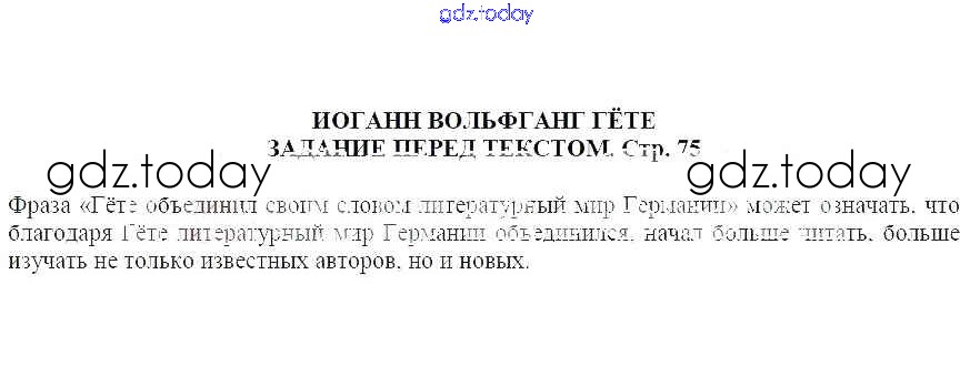 На страницах сайта gdz.today вы найдете учебный и вспомогательный материал, направленный на улучшения знаний школьной программы. ГДЗ - онлайн мир знаний Иоганн Вольфганг Гёте Решение к части 2 Задание перед текстом (стр. 75) Учебнику по Литературе для 5 класса Москвин Вентана-граф Алгоритм успеха 2020
