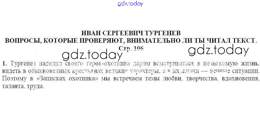 На страницах сайта gdz.today вы найдете учебный и вспомогательный материал, направленный на улучшения знаний школьной программы. ГДЗ - онлайн мир знаний Вопросы, которые проверяют, внимательно ли ты читал текст (стр. 106) Иван Сергеевич Тургенев 1 Учебнику по Литературе для 5 класса Москвин Вентана-граф Алгоритм успеха 2020
