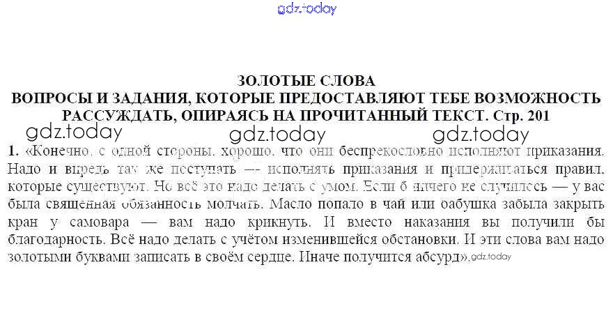 На страницах сайта gdz.today вы найдете учебный и вспомогательный материал, направленный на улучшения знаний школьной программы. ГДЗ - онлайн мир знаний Вопросы и задания, которые дают тебе возможность рассуждать, опираясь на прочитанный текст (стр. 201) Золотые слова 1 Учебнику по Литературе для 5 класса Москвин Вентана-граф Алгоритм успеха 2020