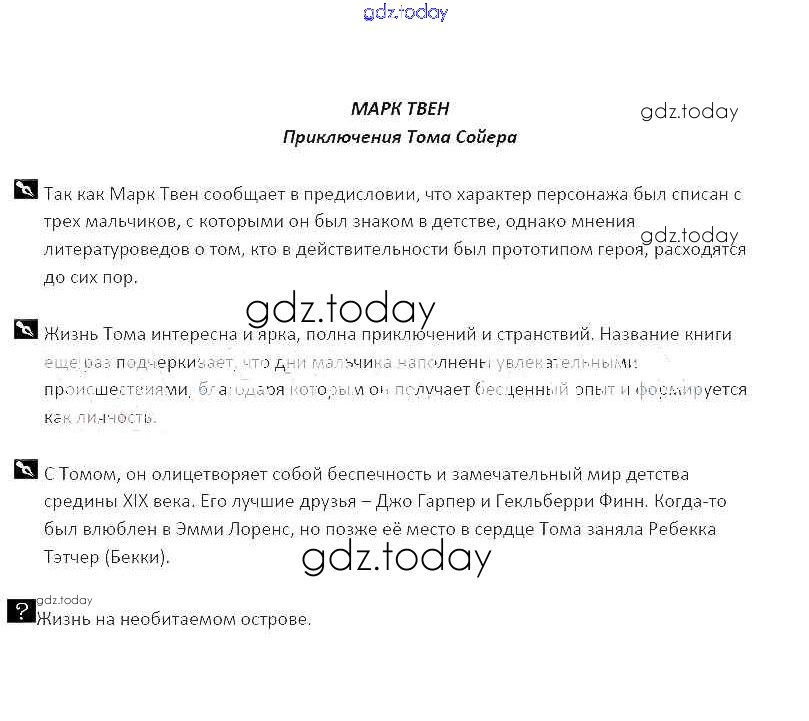 На страницах сайта gdz.today вы найдете учебный и вспомогательный материал, направленный на улучшения знаний школьной программы. ГДЗ - онлайн мир знаний Решение к части 2. Темы Марк Твен Приключения Тома Сойера Рабочей тетради по Литературе для 5 класса Курдюмова Дрофа Вертикаль 2017