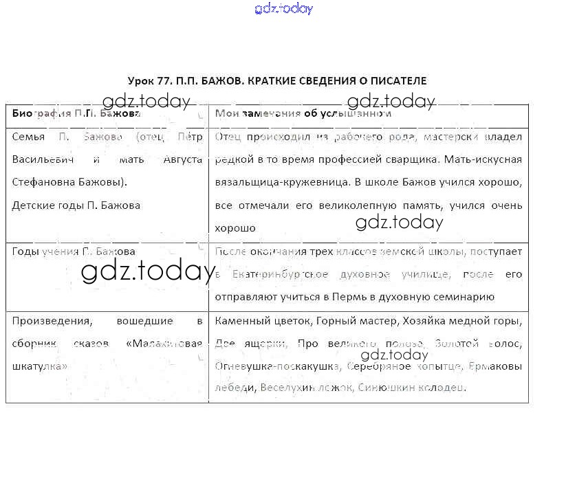 На страницах сайта gdz.today вы найдете учебный и вспомогательный материал, направленный на улучшения знаний школьной программы. ГДЗ - онлайн мир знаний Решение к урокам 77 Рабочей тетради по Литературе для 5 класса Соловьева Русское слово Инновационная школа 2016
