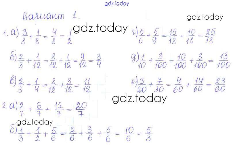 Ответы к ПР №30. Сложение дробей Решение к проверочным работам вариант-1 Дидактическим материалам по Математике для 5 класса Кузнецова, Минаева Просвещение Академический школьный учебник 2014
