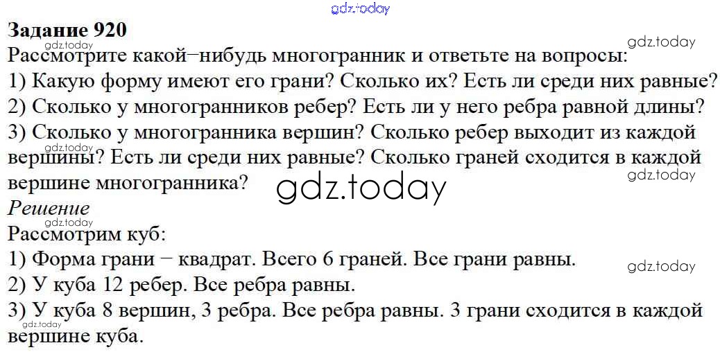 На страницах сайта gdz.today вы найдете учебный и вспомогательный материал, направленный на улучшения знаний школьной программы. ГДЗ - онлайн мир знаний 10.1. Геометрические тела и их изображение Глава 10. Многогранники 920 Учебнику по Математике для 5 класса Дорофеев, Шарыгин Просвещение 2015