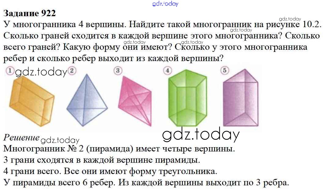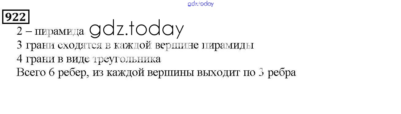 На страницах сайта gdz.today вы найдете учебный и вспомогательный материал, направленный на улучшения знаний школьной программы. ГДЗ - онлайн мир знаний 10.1. Геометрические тела и их изображение Глава 10. Многогранники 922 Учебнику по Математике для 5 класса Дорофеев, Шарыгин Просвещение 2015