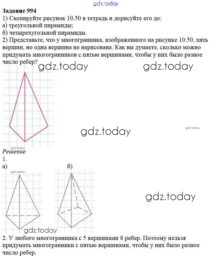 На страницах сайта gdz.today вы найдете учебный и вспомогательный материал, направленный на улучшения знаний школьной программы. ГДЗ - онлайн мир знаний 10.4. Пирамида Глава 10. Многогранники 994 Учебнику по Математике для 5 класса Дорофеев, Шарыгин Просвещение 2015