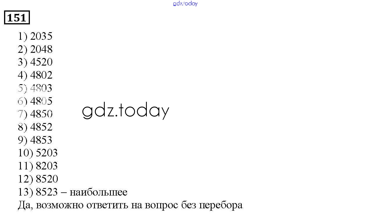 На страницах сайта gdz.today вы найдете учебный и вспомогательный материал, направленный на улучшения знаний школьной программы. ГДЗ - онлайн мир знаний 2.5. Решение комбинаторных задач Решение к главе 2. Натуральные числа 151 Учебнику по Математике для 5 класса Дорофеев, Шарыгин Просвещение 2015