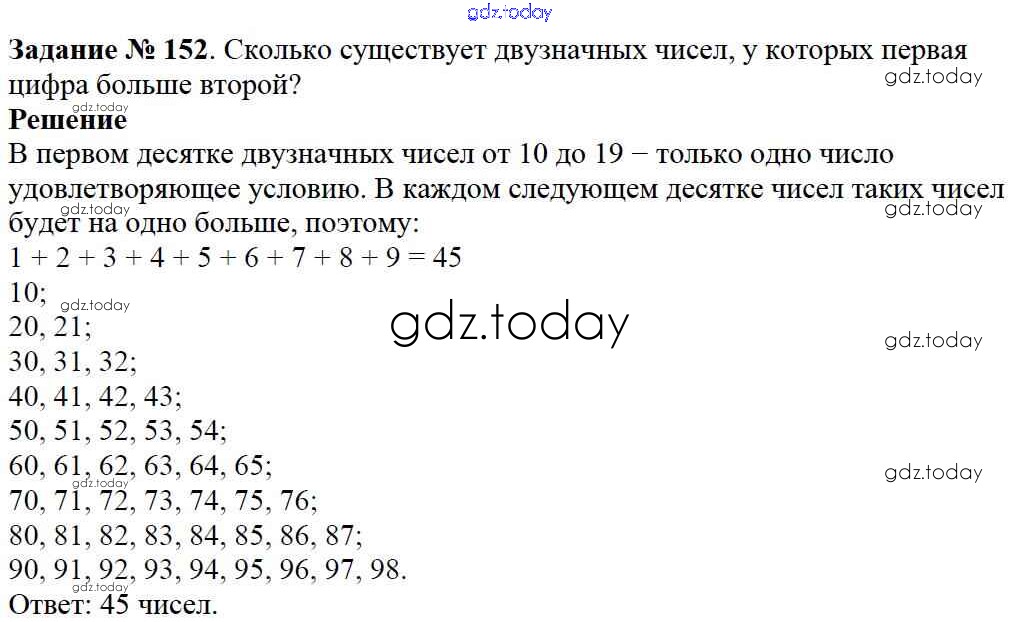 На страницах сайта gdz.today вы найдете учебный и вспомогательный материал, направленный на улучшения знаний школьной программы. ГДЗ - онлайн мир знаний 2.5. Решение комбинаторных задач Решение к главе 2. Натуральные числа 152 Учебнику по Математике для 5 класса Дорофеев, Шарыгин Просвещение 2015