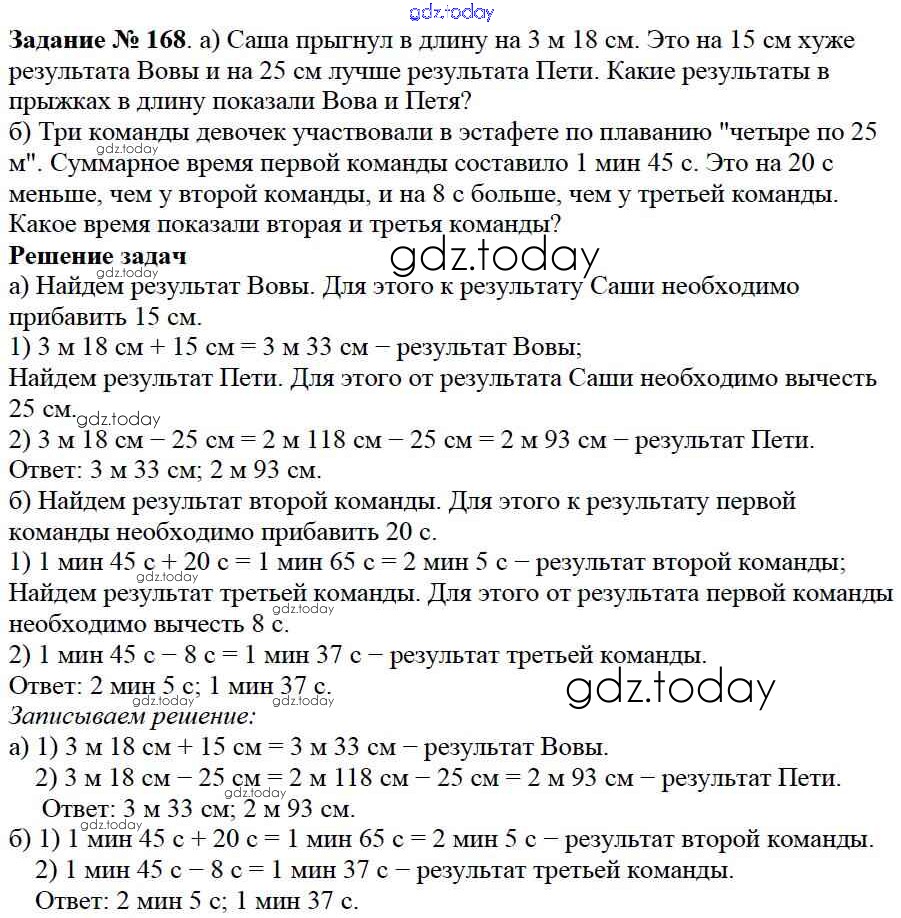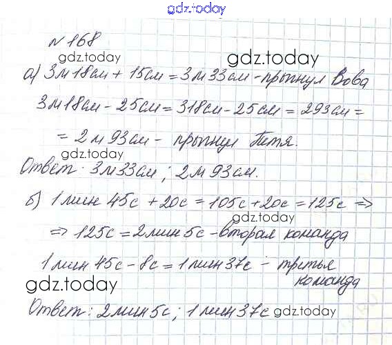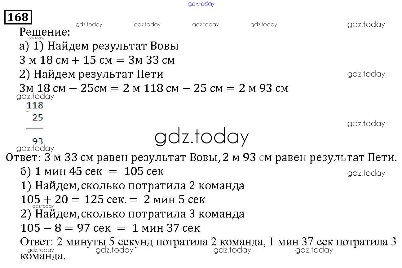 На страницах сайта gdz.today вы найдете учебный и вспомогательный материал, направленный на улучшения знаний школьной программы. ГДЗ - онлайн мир знаний 3.1. Сложение и вычитание Решение к главе 3. Действия с натуральными числами 168 Учебнику по Математике для 5 класса Дорофеев, Шарыгин Просвещение 2015