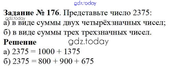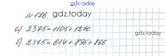 На страницах сайта gdz.today вы найдете учебный и вспомогательный материал, направленный на улучшения знаний школьной программы. ГДЗ - онлайн мир знаний 3.1. Сложение и вычитание Решение к главе 3. Действия с натуральными числами 176 Учебнику по Математике для 5 класса Дорофеев, Шарыгин Просвещение 2015