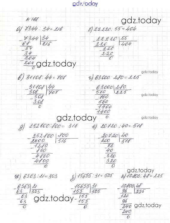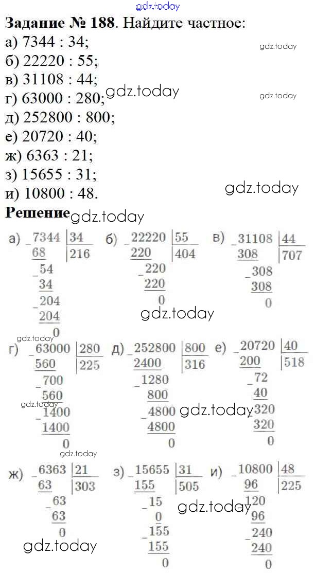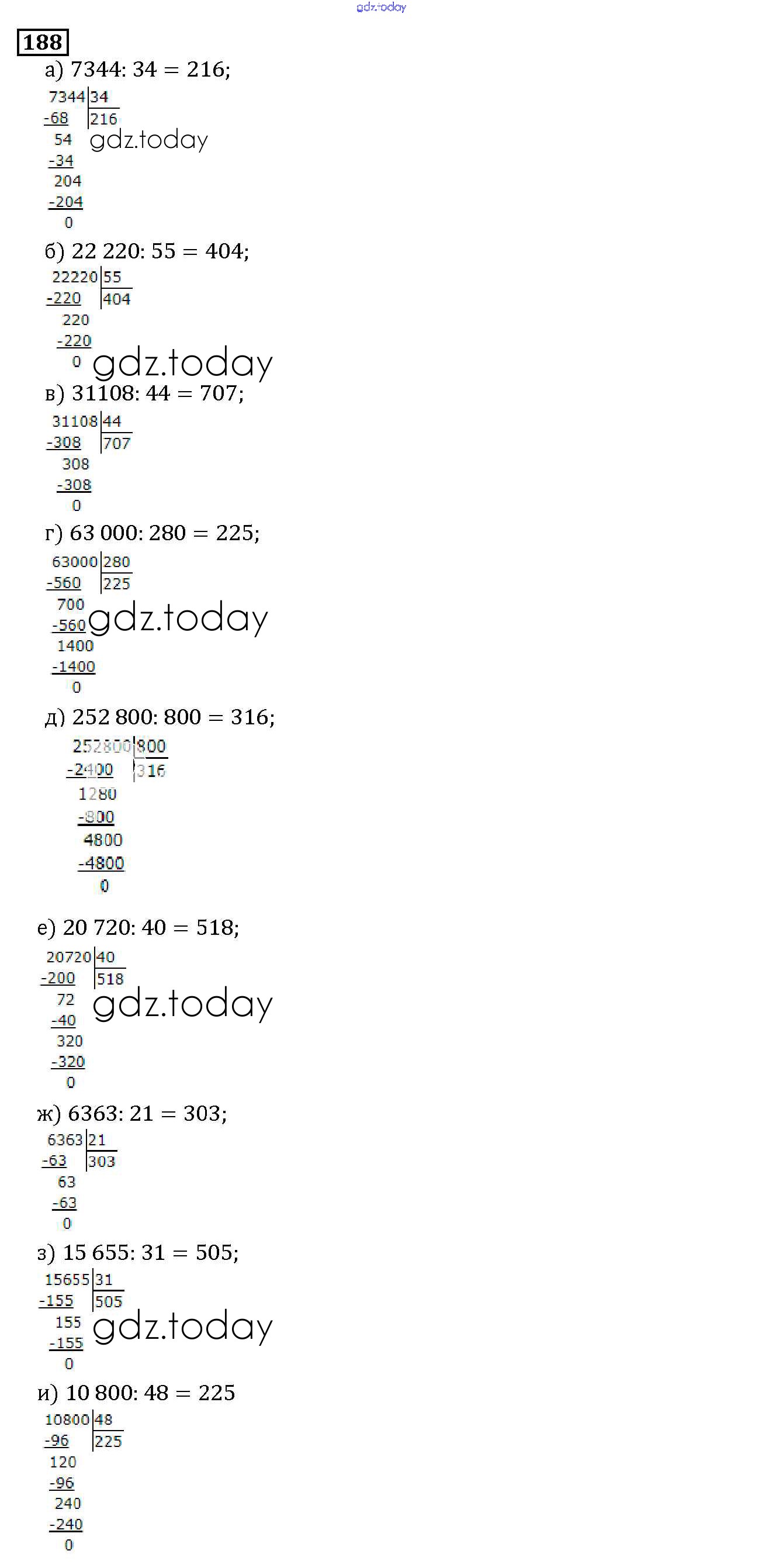 На страницах сайта gdz.today вы найдете учебный и вспомогательный материал, направленный на улучшения знаний школьной программы. ГДЗ - онлайн мир знаний 3.2. Умножение и деление Решение к главе 3. Действия с натуральными числами 188 Учебнику по Математике для 5 класса Дорофеев, Шарыгин Просвещение 2015