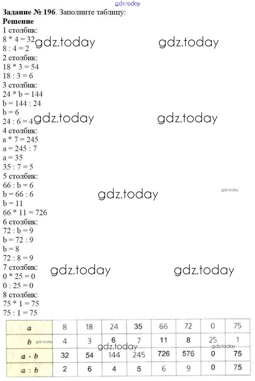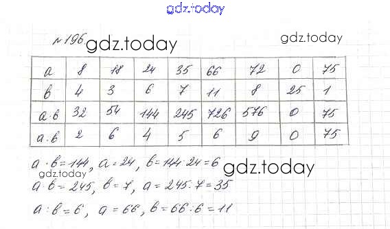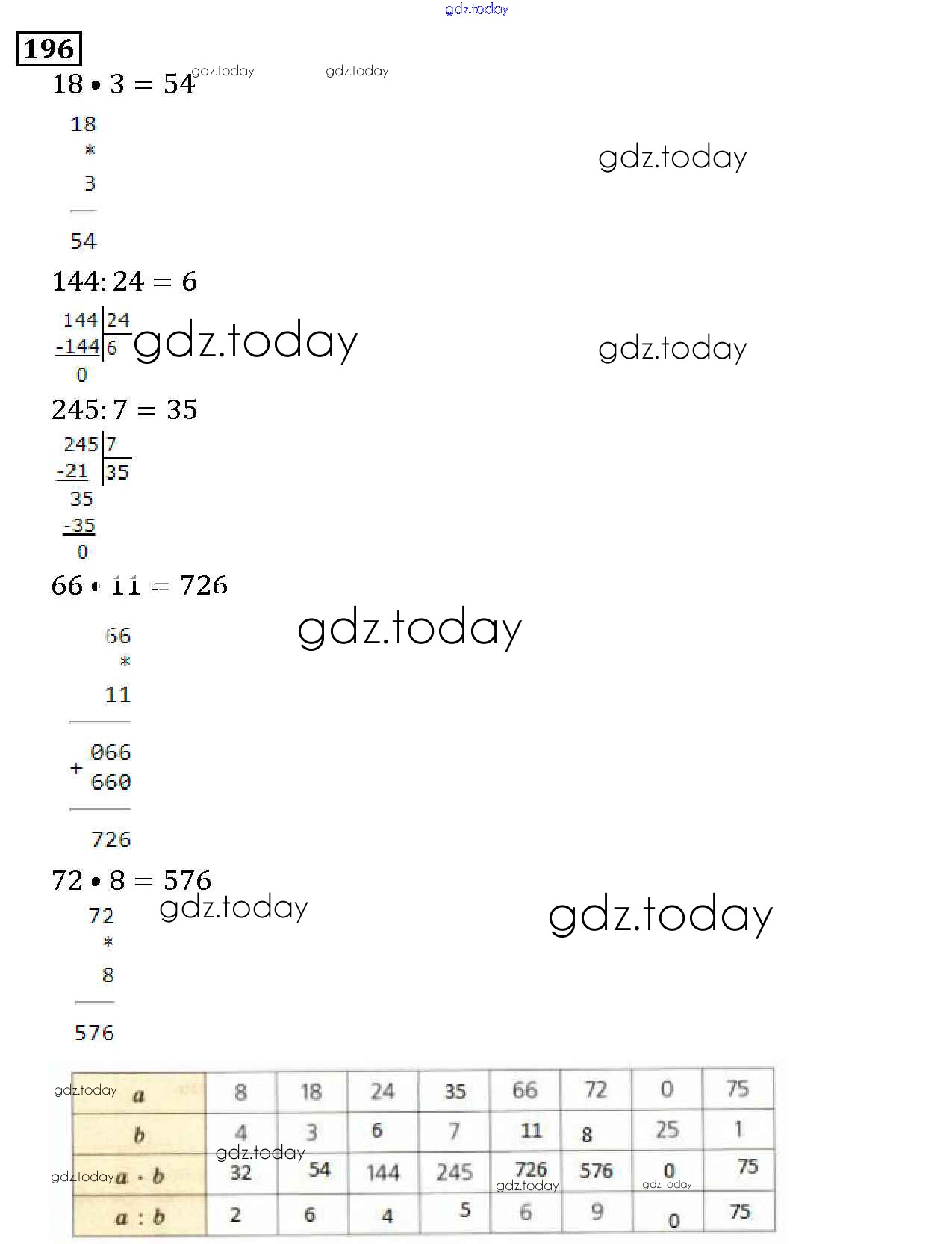 На страницах сайта gdz.today вы найдете учебный и вспомогательный материал, направленный на улучшения знаний школьной программы. ГДЗ - онлайн мир знаний 3.2. Умножение и деление Решение к главе 3. Действия с натуральными числами 196 Учебнику по Математике для 5 класса Дорофеев, Шарыгин Просвещение 2015