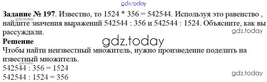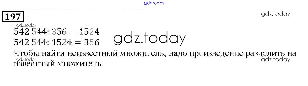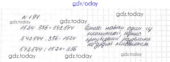 На страницах сайта gdz.today вы найдете учебный и вспомогательный материал, направленный на улучшения знаний школьной программы. ГДЗ - онлайн мир знаний 3.2. Умножение и деление Решение к главе 3. Действия с натуральными числами 197 Учебнику по Математике для 5 класса Дорофеев, Шарыгин Просвещение 2015