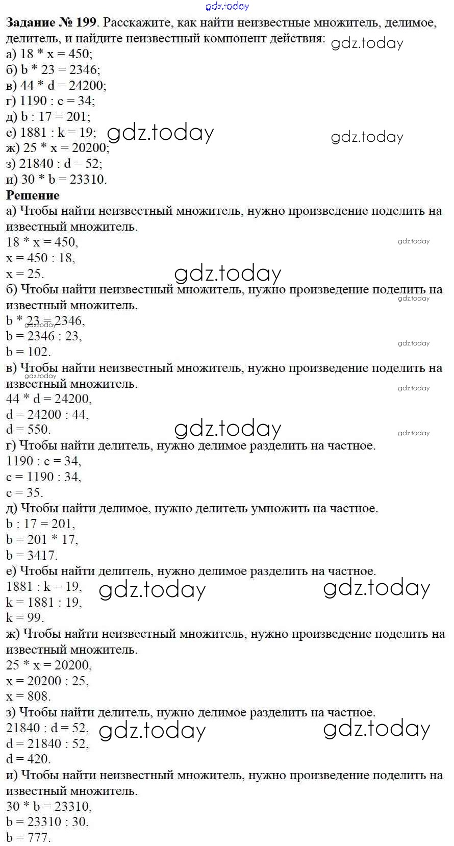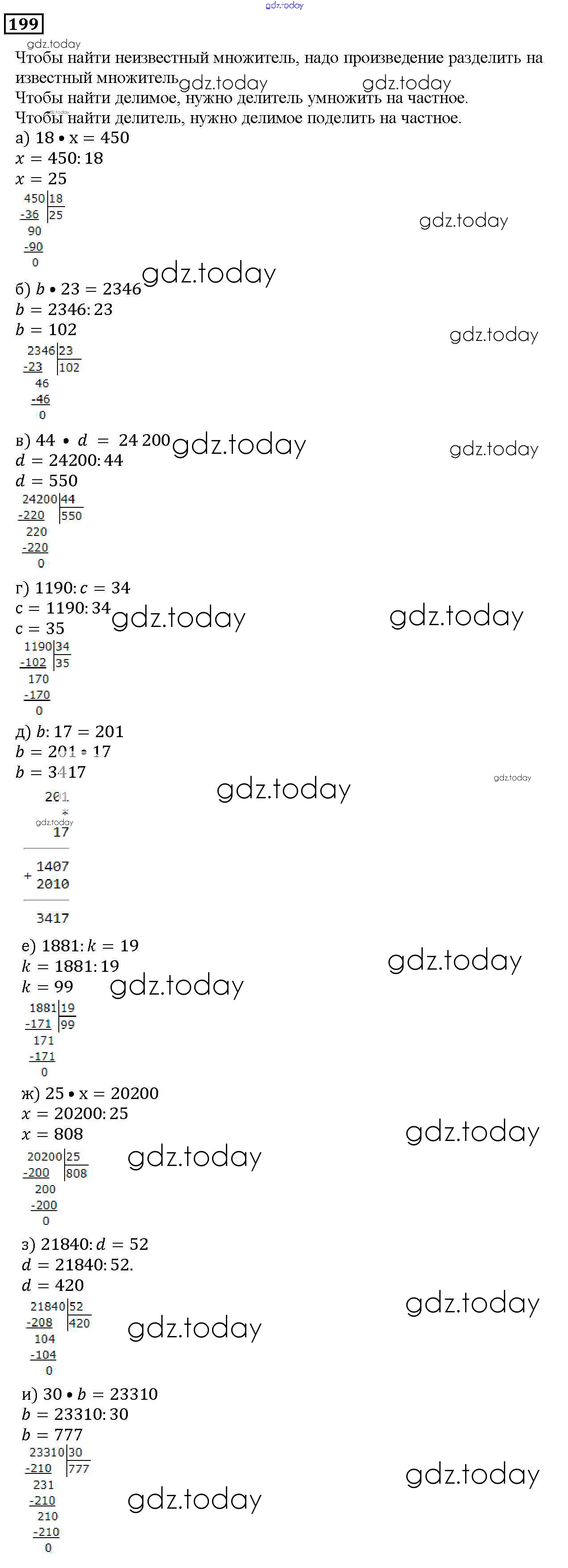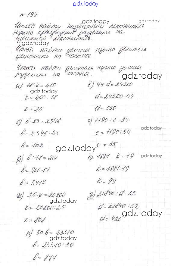 На страницах сайта gdz.today вы найдете учебный и вспомогательный материал, направленный на улучшения знаний школьной программы. ГДЗ - онлайн мир знаний 3.2. Умножение и деление Решение к главе 3. Действия с натуральными числами 199 Учебнику по Математике для 5 класса Дорофеев, Шарыгин Просвещение 2015