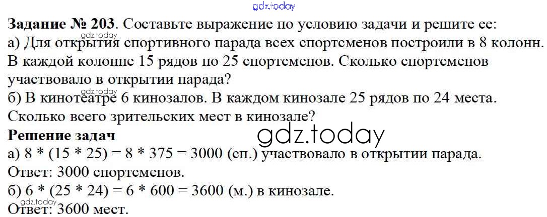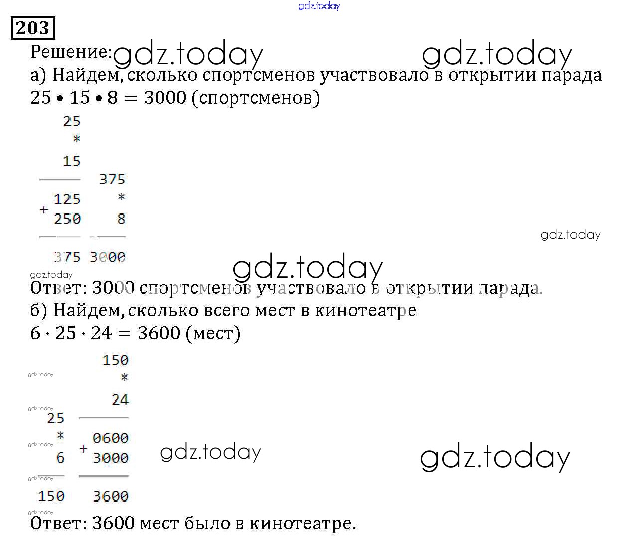 На страницах сайта gdz.today вы найдете учебный и вспомогательный материал, направленный на улучшения знаний школьной программы. ГДЗ - онлайн мир знаний 3.2. Умножение и деление Решение к главе 3. Действия с натуральными числами 203 Учебнику по Математике для 5 класса Дорофеев, Шарыгин Просвещение 2015