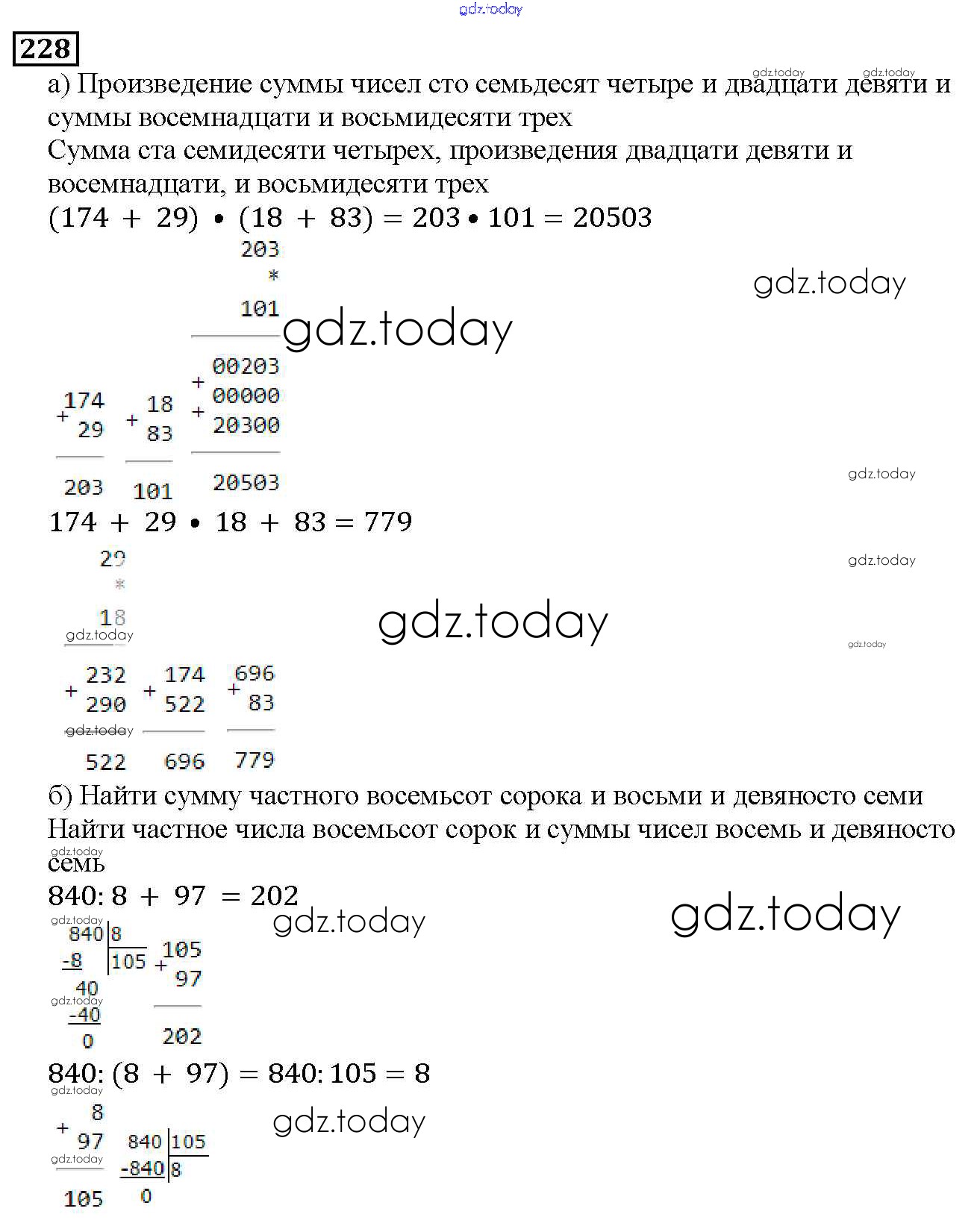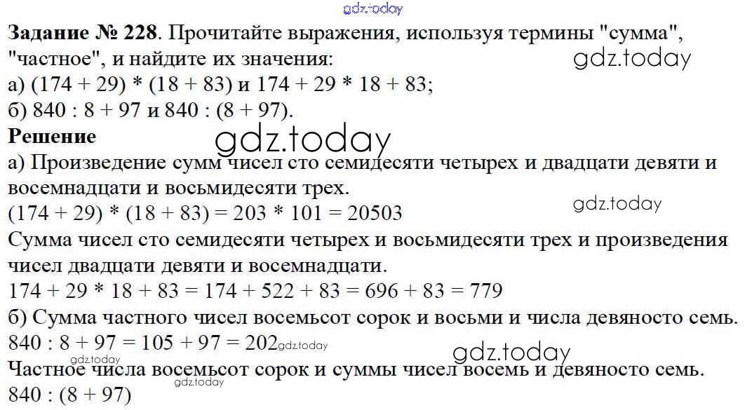 На страницах сайта gdz.today вы найдете учебный и вспомогательный материал, направленный на улучшения знаний школьной программы. ГДЗ - онлайн мир знаний 3.3. Порядок действий в вычислениях Решение к главе 3. Действия с натуральными числами 228 Учебнику по Математике для 5 класса Дорофеев, Шарыгин Просвещение 2015