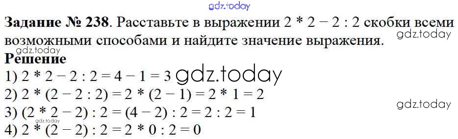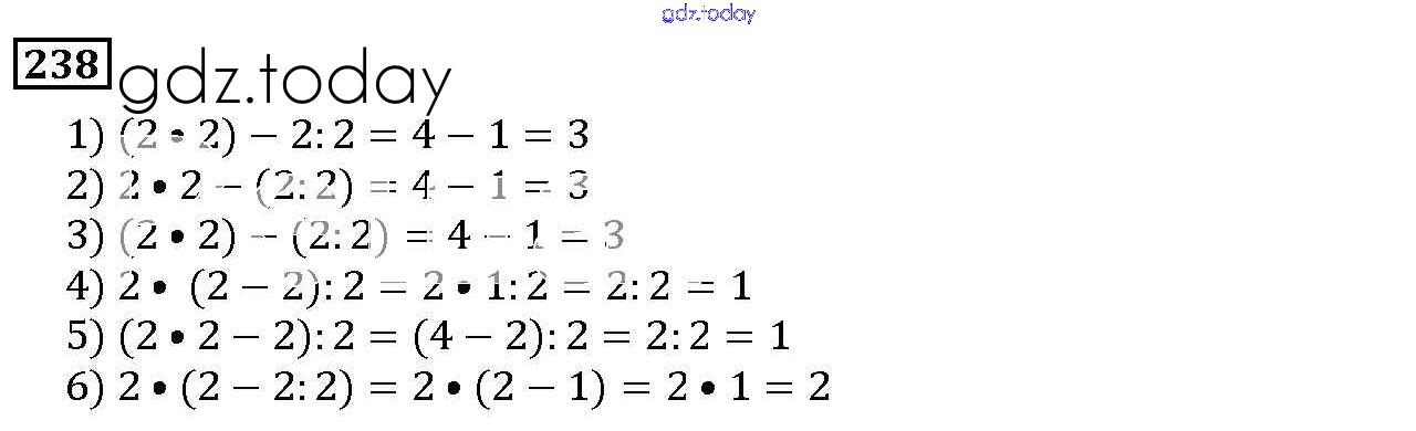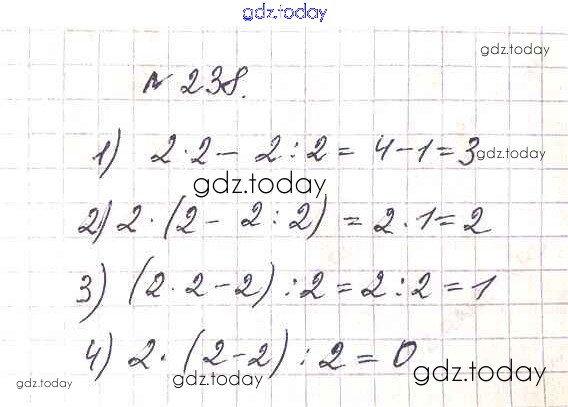 На страницах сайта gdz.today вы найдете учебный и вспомогательный материал, направленный на улучшения знаний школьной программы. ГДЗ - онлайн мир знаний 3.3. Порядок действий в вычислениях Решение к главе 3. Действия с натуральными числами 238 Учебнику по Математике для 5 класса Дорофеев, Шарыгин Просвещение 2015