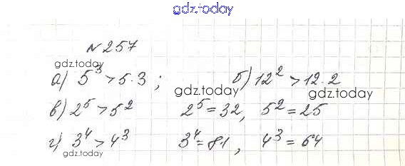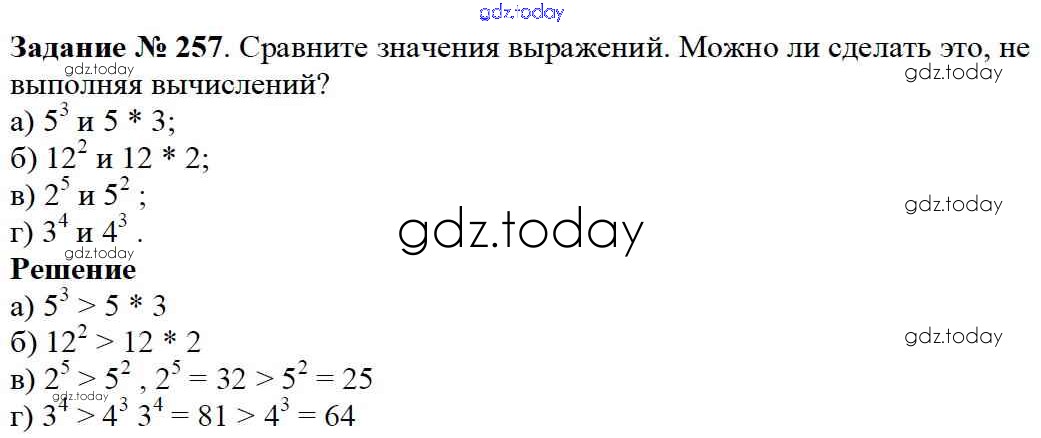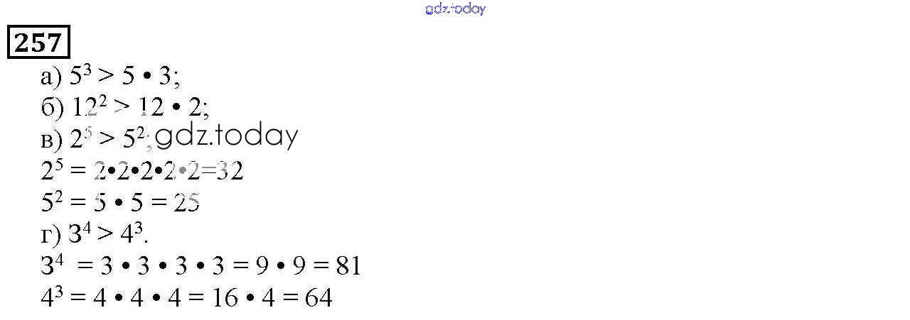 На страницах сайта gdz.today вы найдете учебный и вспомогательный материал, направленный на улучшения знаний школьной программы. ГДЗ - онлайн мир знаний 3.4. Степень числа Решение к главе 3. Действия с натуральными числами 257 Учебнику по Математике для 5 класса Дорофеев, Шарыгин Просвещение 2015