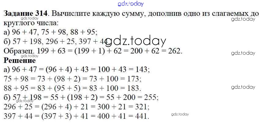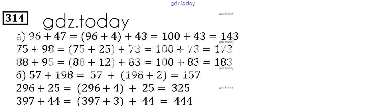 На страницах сайта gdz.today вы найдете учебный и вспомогательный материал, направленный на улучшения знаний школьной программы. ГДЗ - онлайн мир знаний 4.1. Свойства сложения и умножения Решение к главе 4. Использование свойств действий при вычислениях 314 Учебнику по Математике для 5 класса Дорофеев, Шарыгин Просвещение 2015