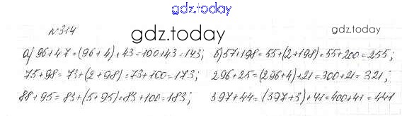 Ответы к 4.1. Свойства сложения и умножения Решение к главе 4. Использование свойств действий при вычислениях 314 Учебнику по Математике для 5 класса Дорофеев, Шарыгин Просвещение 2015