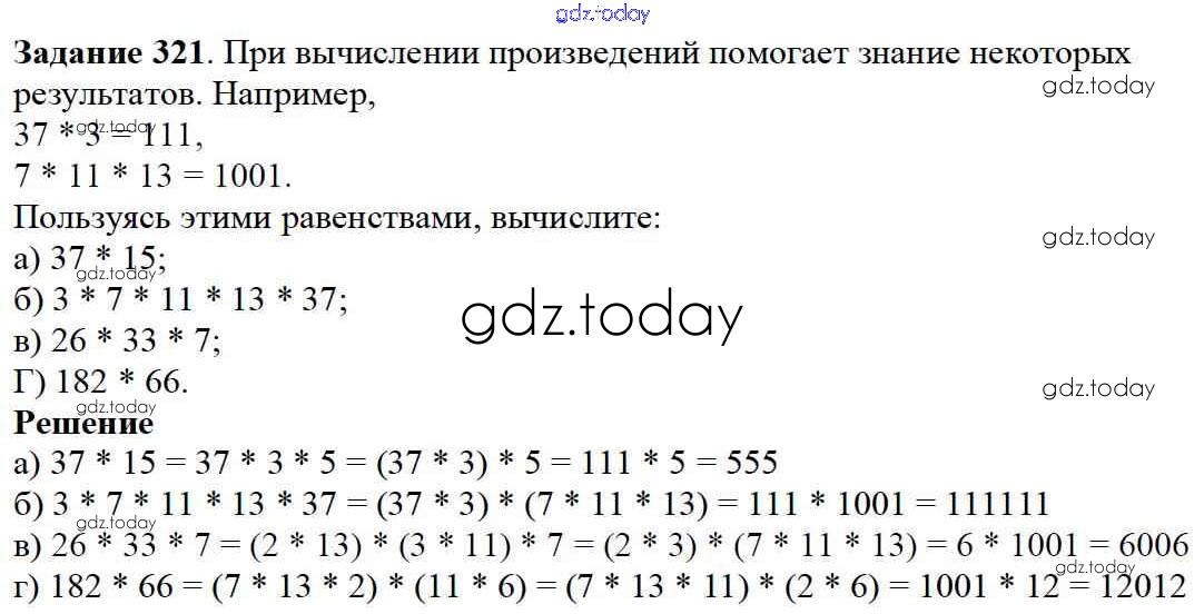 На страницах сайта gdz.today вы найдете учебный и вспомогательный материал, направленный на улучшения знаний школьной программы. ГДЗ - онлайн мир знаний 4.1. Свойства сложения и умножения Решение к главе 4. Использование свойств действий при вычислениях 321 Учебнику по Математике для 5 класса Дорофеев, Шарыгин Просвещение 2015