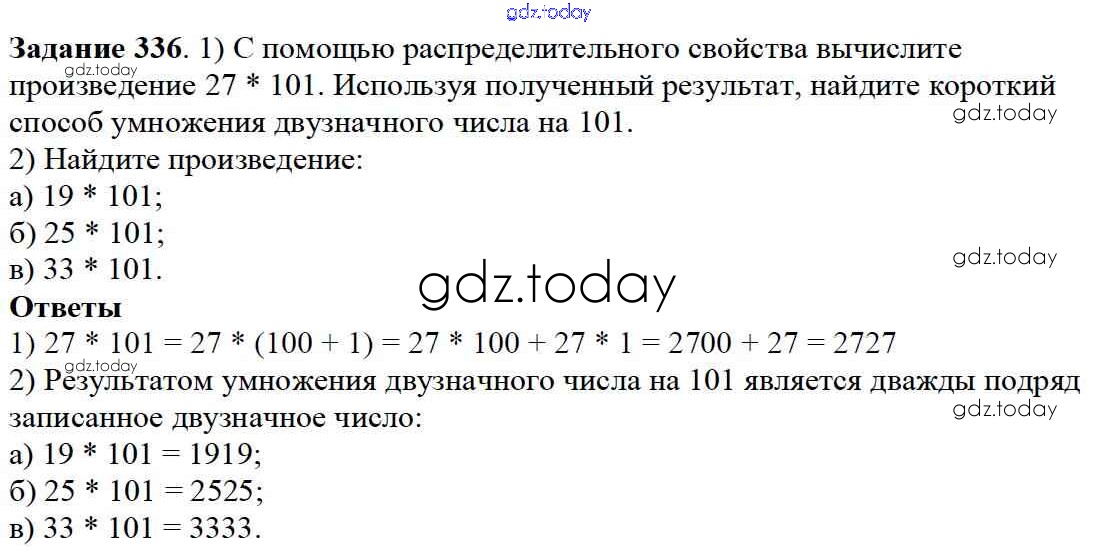 На страницах сайта gdz.today вы найдете учебный и вспомогательный материал, направленный на улучшения знаний школьной программы. ГДЗ - онлайн мир знаний 4.2. Распределительное свойство Решение к главе 4. Использование свойств действий при вычислениях 336 Учебнику по Математике для 5 класса Дорофеев, Шарыгин Просвещение 2015