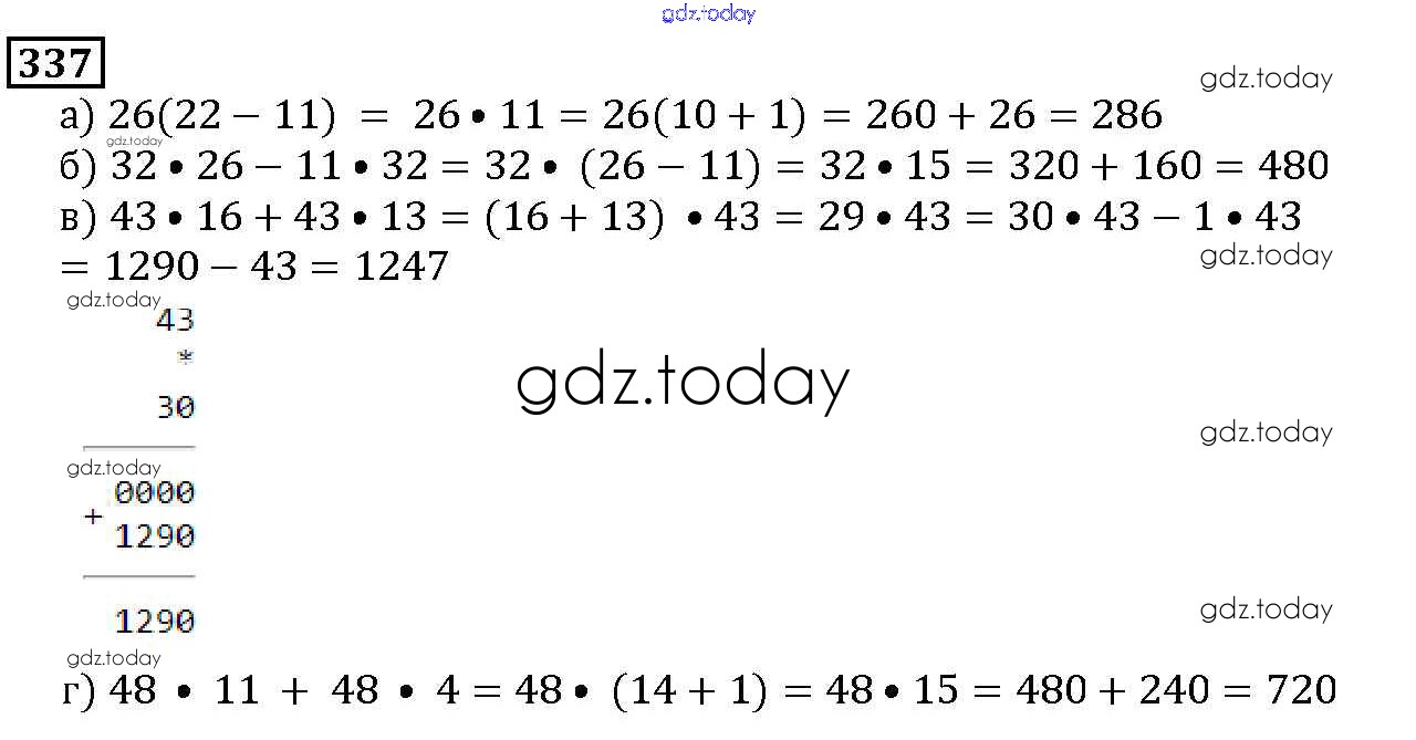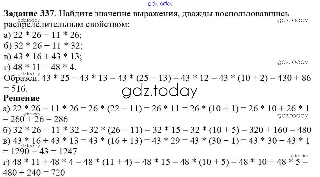 На страницах сайта gdz.today вы найдете учебный и вспомогательный материал, направленный на улучшения знаний школьной программы. ГДЗ - онлайн мир знаний 4.2. Распределительное свойство Решение к главе 4. Использование свойств действий при вычислениях 337 Учебнику по Математике для 5 класса Дорофеев, Шарыгин Просвещение 2015