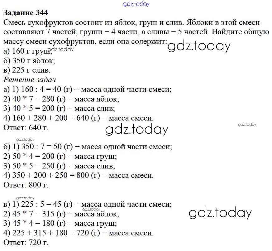 На страницах сайта gdz.today вы найдете учебный и вспомогательный материал, направленный на улучшения знаний школьной программы. ГДЗ - онлайн мир знаний 4.3. Задачи на части Решение к главе 4. Использование свойств действий при вычислениях 344 Учебнику по Математике для 5 класса Дорофеев, Шарыгин Просвещение 2015