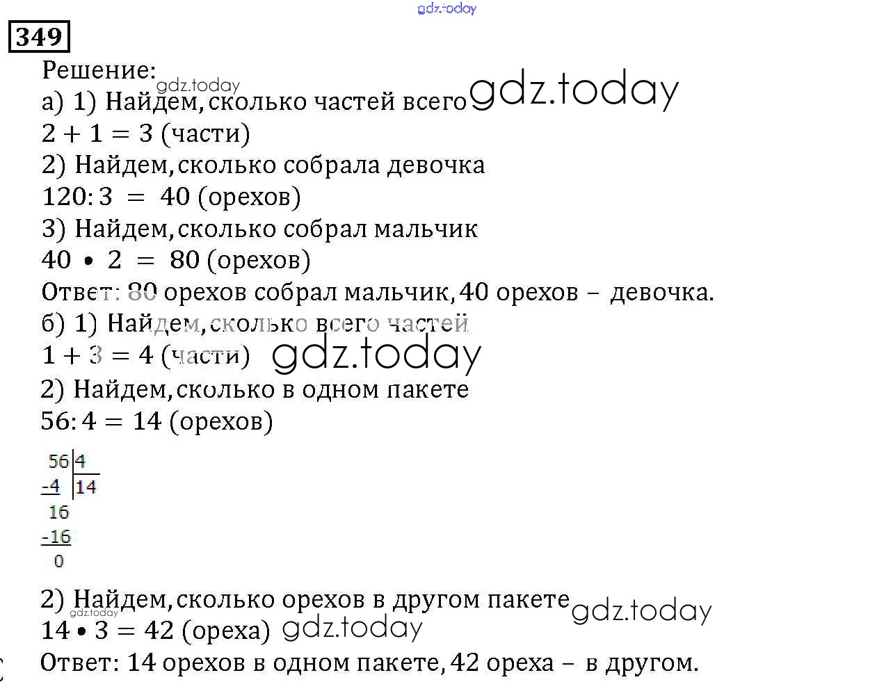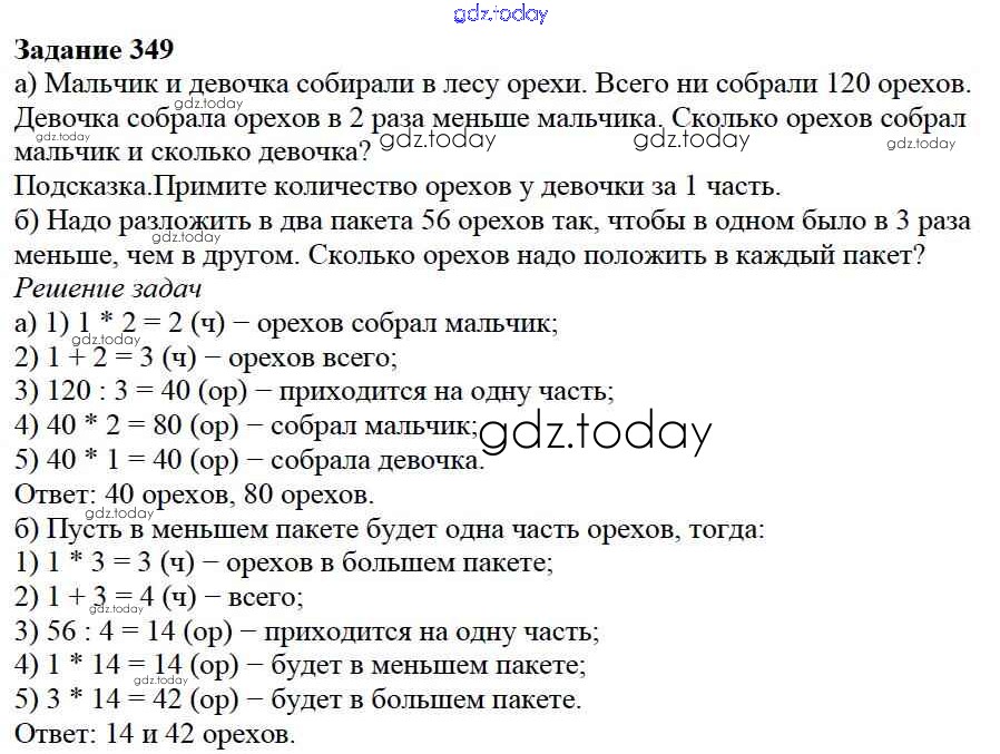 На страницах сайта gdz.today вы найдете учебный и вспомогательный материал, направленный на улучшения знаний школьной программы. ГДЗ - онлайн мир знаний 4.3. Задачи на части Решение к главе 4. Использование свойств действий при вычислениях 349 Учебнику по Математике для 5 класса Дорофеев, Шарыгин Просвещение 2015