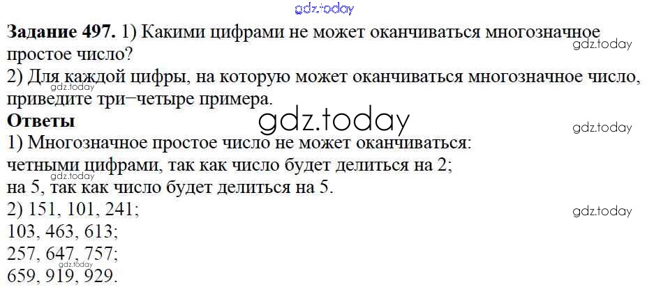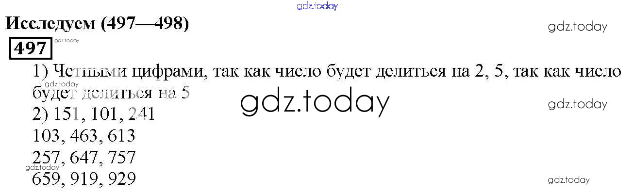 На страницах сайта gdz.today вы найдете учебный и вспомогательный материал, направленный на улучшения знаний школьной программы. ГДЗ - онлайн мир знаний 6.4. Признаки делимости Решение к главе 6. Делимость чисел 497 Учебнику по Математике для 5 класса Дорофеев, Шарыгин Просвещение 2015