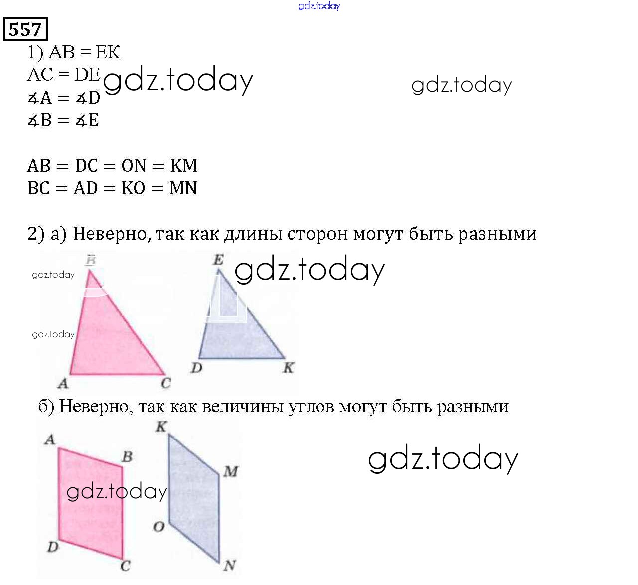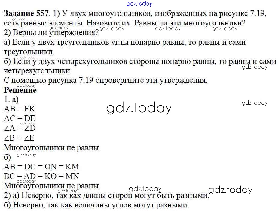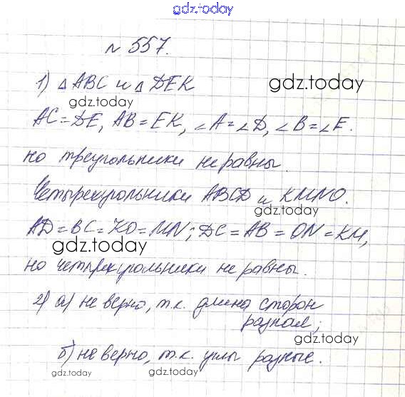 На страницах сайта gdz.today вы найдете учебный и вспомогательный материал, направленный на улучшения знаний школьной программы. ГДЗ - онлайн мир знаний 7.3. Равенство фигур Глава 7. Треугольники и четырехугольники 557 Учебнику по Математике для 5 класса Дорофеев, Шарыгин Просвещение 2015