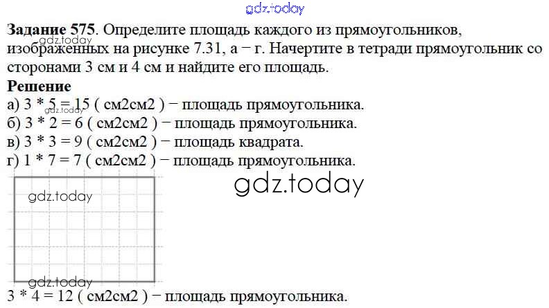 На страницах сайта gdz.today вы найдете учебный и вспомогательный материал, направленный на улучшения знаний школьной программы. ГДЗ - онлайн мир знаний 7.4. Площадь прямоугольника Глава 7. Треугольники и четырехугольники 575 Учебнику по Математике для 5 класса Дорофеев, Шарыгин Просвещение 2015