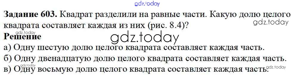 На страницах сайта gdz.today вы найдете учебный и вспомогательный материал, направленный на улучшения знаний школьной программы. ГДЗ - онлайн мир знаний 8.1. Доли Глава 8. Дроби 603 Учебнику по Математике для 5 класса Дорофеев, Шарыгин Просвещение 2015