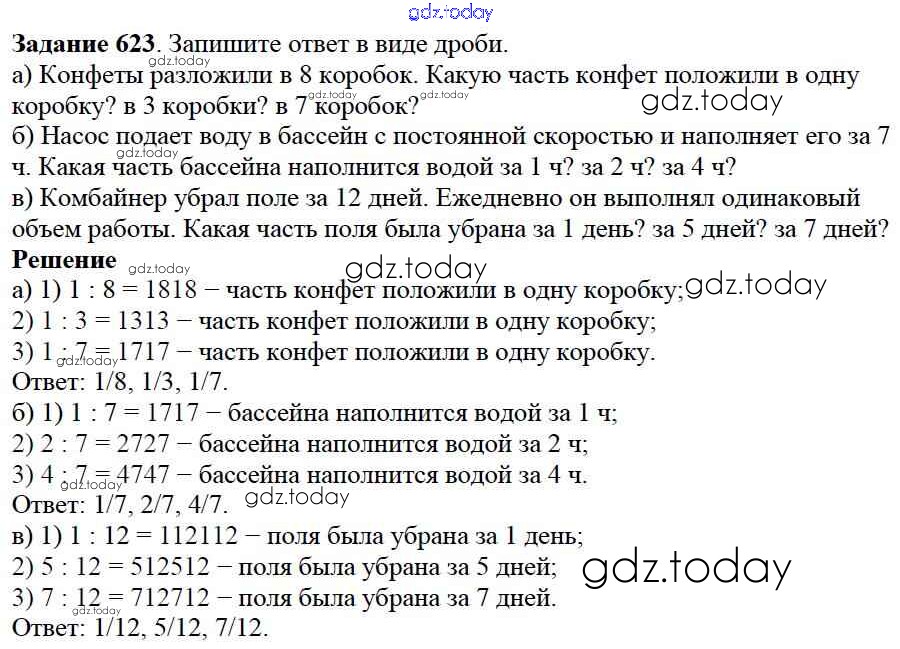На страницах сайта gdz.today вы найдете учебный и вспомогательный материал, направленный на улучшения знаний школьной программы. ГДЗ - онлайн мир знаний 8.2. Что такое дробь Глава 8. Дроби 623 Учебнику по Математике для 5 класса Дорофеев, Шарыгин Просвещение 2015