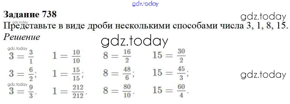 На страницах сайта gdz.today вы найдете учебный и вспомогательный материал, направленный на улучшения знаний школьной программы. ГДЗ - онлайн мир знаний 8.6. Натуральные числа и дроби Глава 8. Дроби 738 Учебнику по Математике для 5 класса Дорофеев, Шарыгин Просвещение 2015