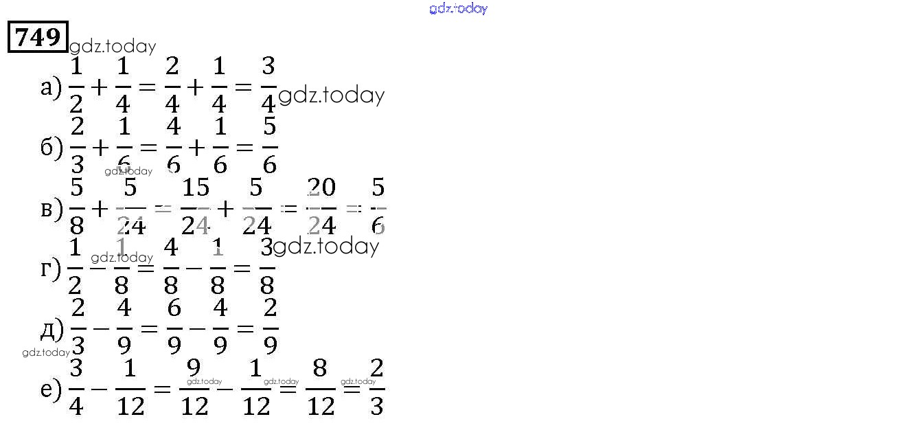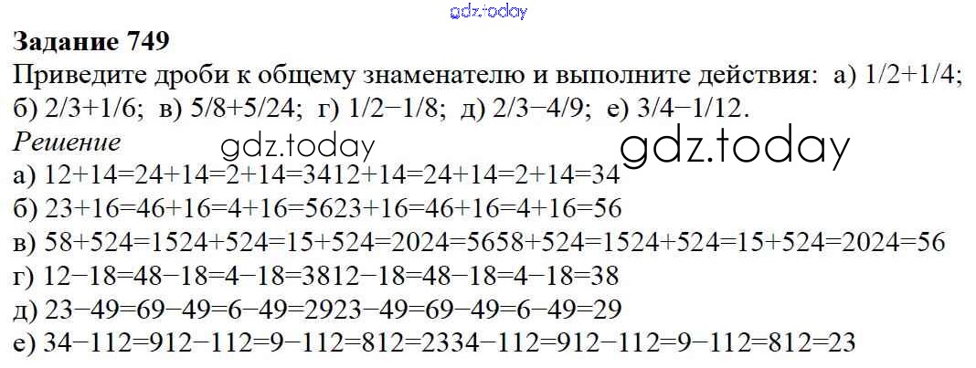 На страницах сайта gdz.today вы найдете учебный и вспомогательный материал, направленный на улучшения знаний школьной программы. ГДЗ - онлайн мир знаний 9.1. Сложение и вычитание дробей Глава 9. Действия с дробями 749 Учебнику по Математике для 5 класса Дорофеев, Шарыгин Просвещение 2015