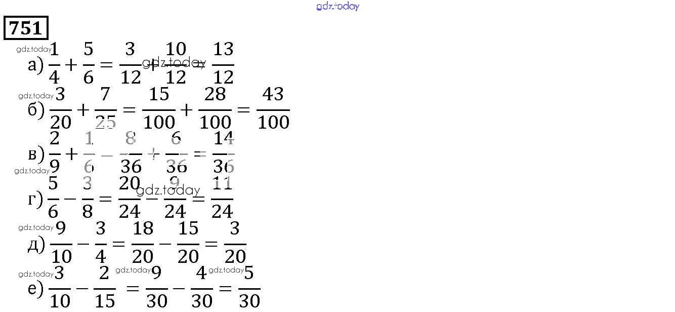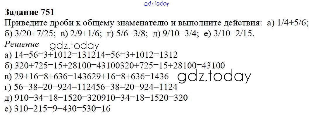 На страницах сайта gdz.today вы найдете учебный и вспомогательный материал, направленный на улучшения знаний школьной программы. ГДЗ - онлайн мир знаний 9.1. Сложение и вычитание дробей Глава 9. Действия с дробями 751 Учебнику по Математике для 5 класса Дорофеев, Шарыгин Просвещение 2015