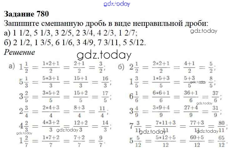 На страницах сайта gdz.today вы найдете учебный и вспомогательный материал, направленный на улучшения знаний школьной программы. ГДЗ - онлайн мир знаний 9.2. Смешанные дроби Глава 9. Действия с дробями 780 Учебнику по Математике для 5 класса Дорофеев, Шарыгин Просвещение 2015
