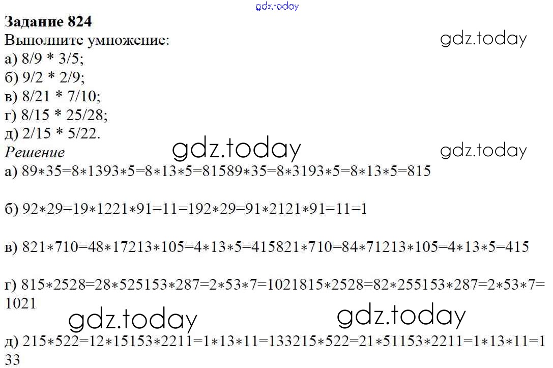 На страницах сайта gdz.today вы найдете учебный и вспомогательный материал, направленный на улучшения знаний школьной программы. ГДЗ - онлайн мир знаний 9.4. Умножение дробей Глава 9. Действия с дробями 824 Учебнику по Математике для 5 класса Дорофеев, Шарыгин Просвещение 2015