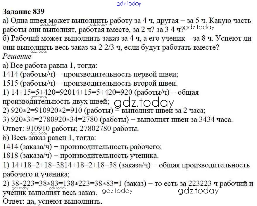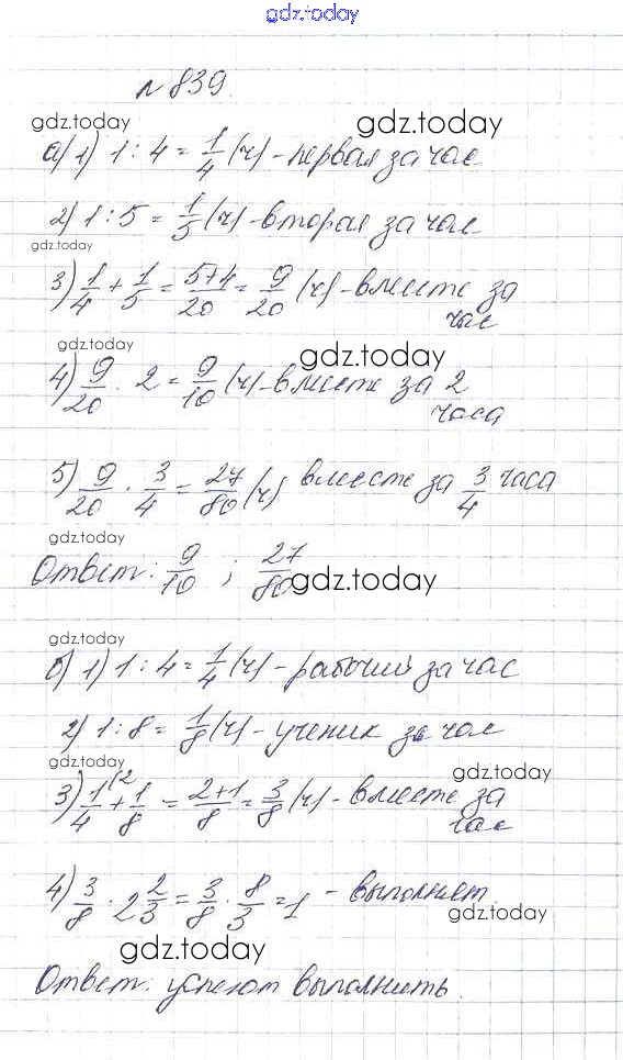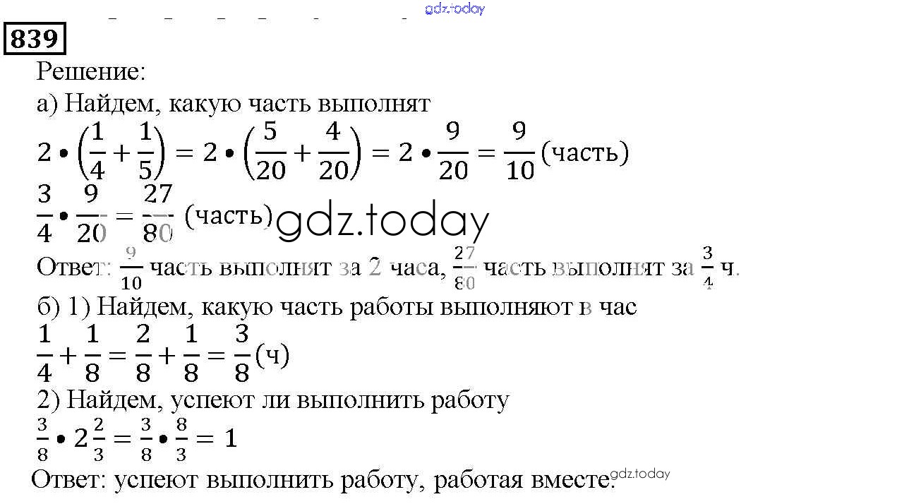 На страницах сайта gdz.today вы найдете учебный и вспомогательный материал, направленный на улучшения знаний школьной программы. ГДЗ - онлайн мир знаний 9.4. Умножение дробей Глава 9. Действия с дробями 839 Учебнику по Математике для 5 класса Дорофеев, Шарыгин Просвещение 2015