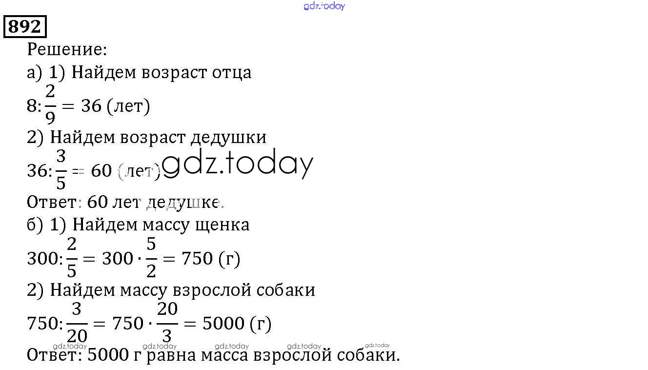 Ответы к 9.6. Нахождение части целого и целого по части Глава 9. Действия с дробями 892 Учебнику по Математике для 5 класса Дорофеев, Шарыгин Просвещение 2015