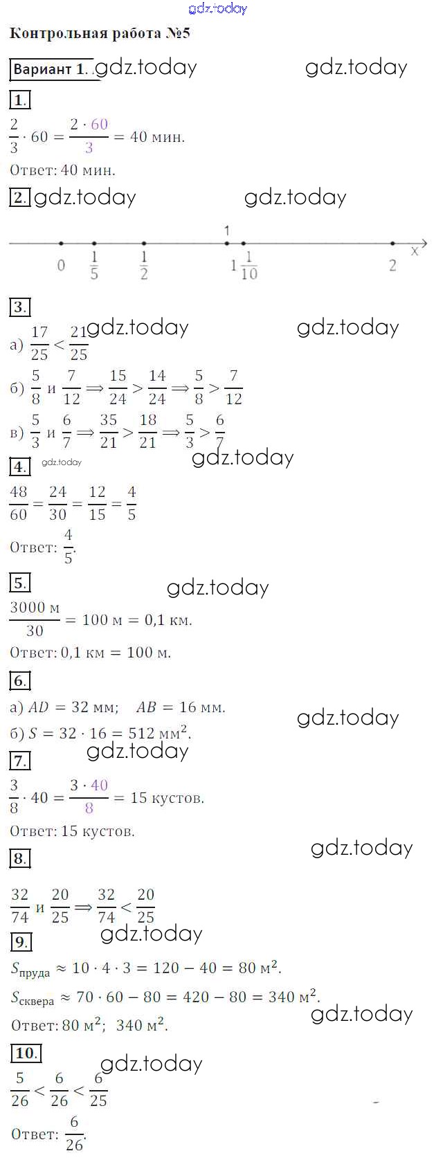 Ответы к Решение к КР №5. Дроби. Треугольник и четырехугольники вариант-1 Контрольным работам по Математике для 5 класса Кузнецова, Минаева Просвещение 2018