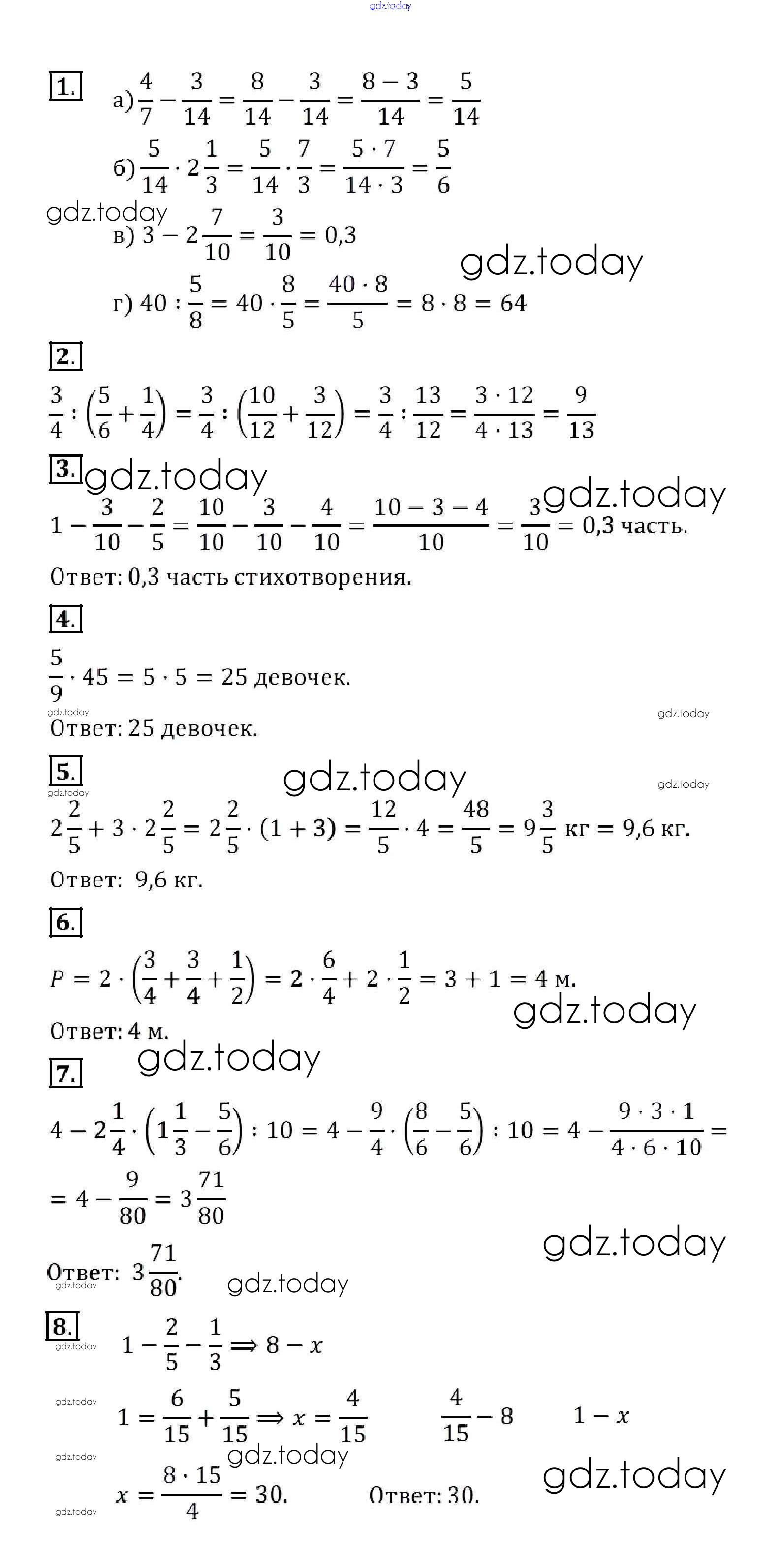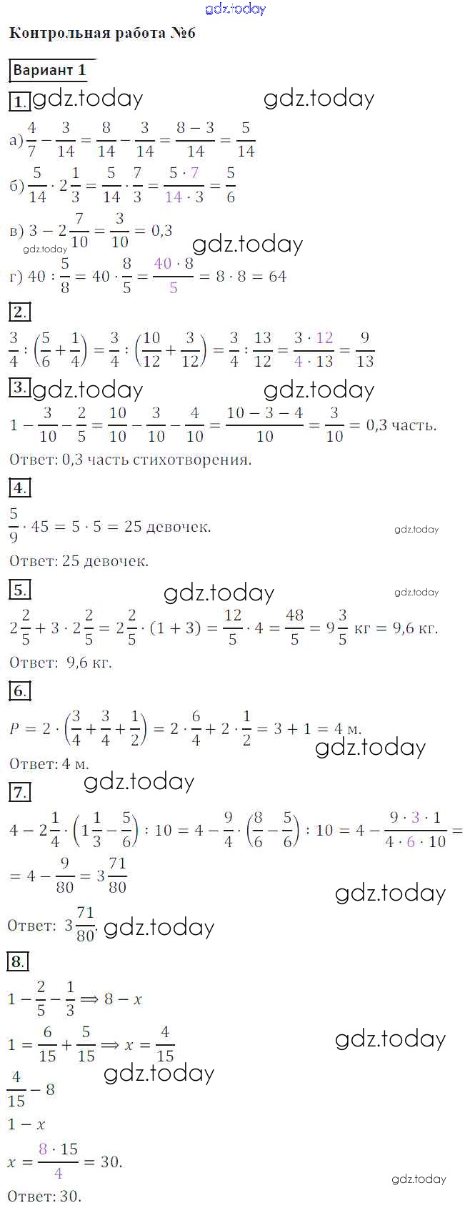 Ответы к Решение к КР №6. Действия с дробями вариант-1 Контрольным работам по Математике для 5 класса Кузнецова, Минаева Просвещение 2018