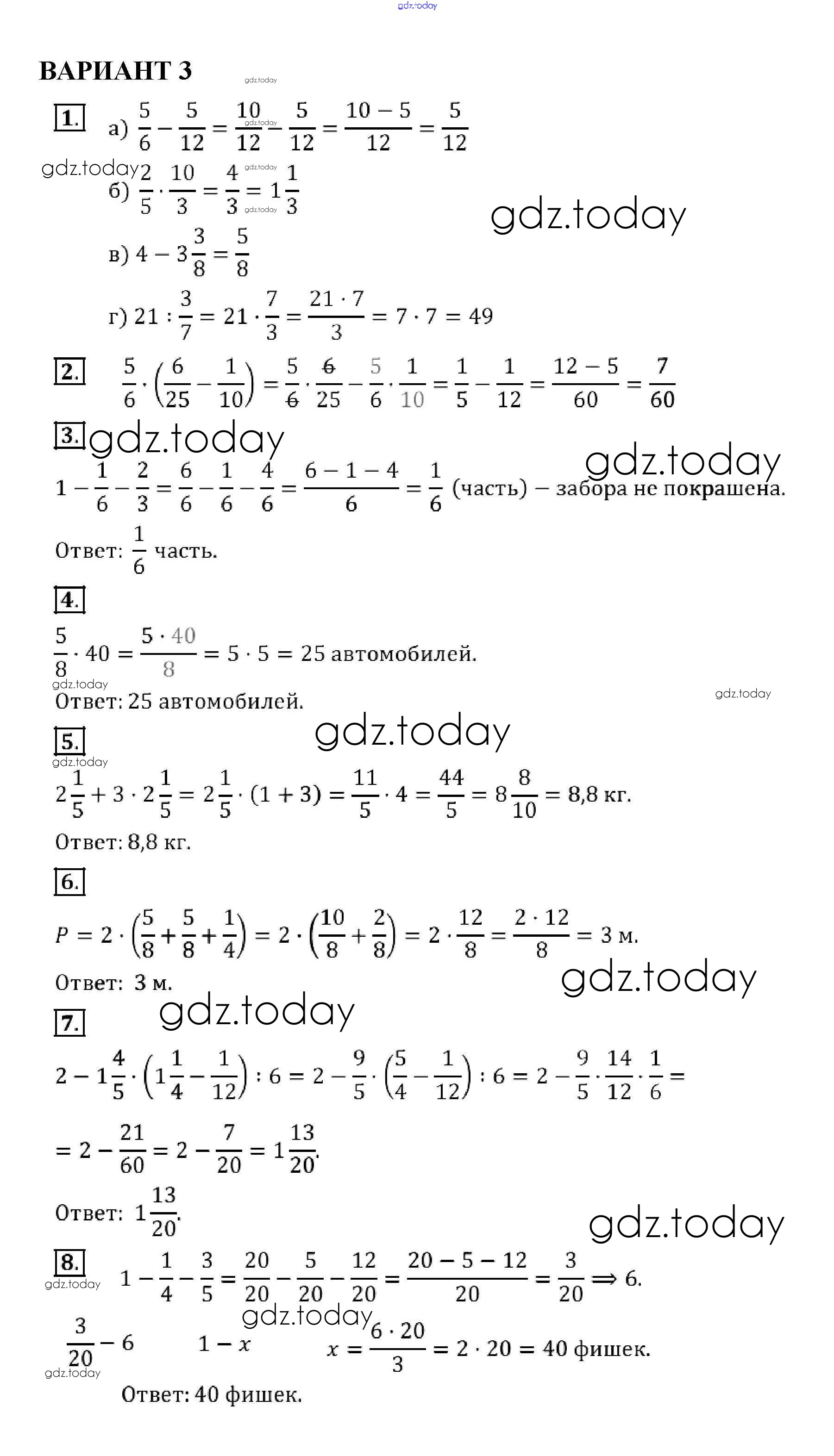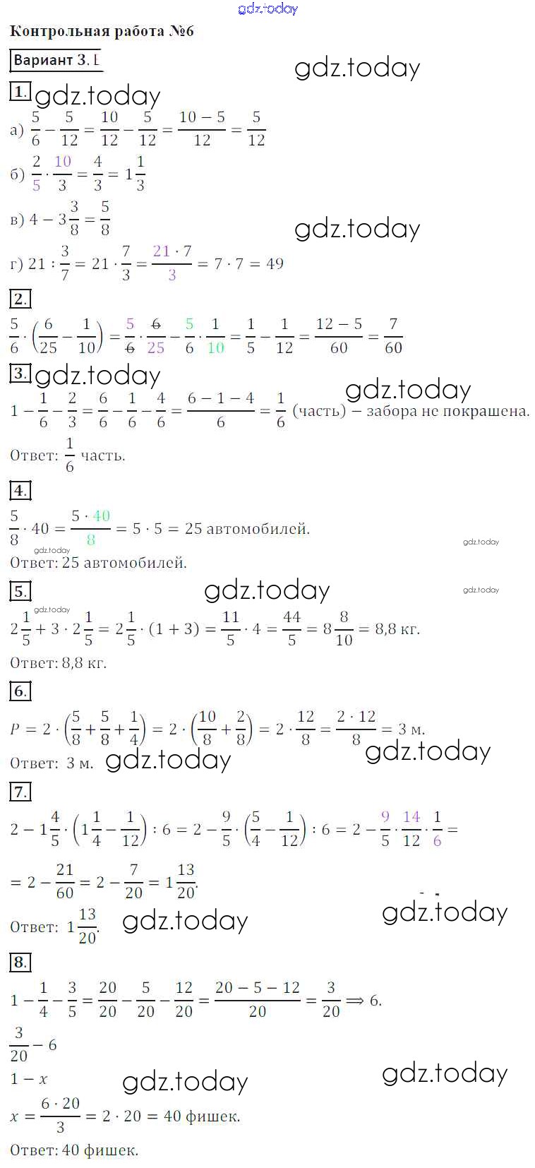 Ответы к Решение к КР №6. Действия с дробями вариант-3 Контрольным работам по Математике для 5 класса Кузнецова, Минаева Просвещение 2018