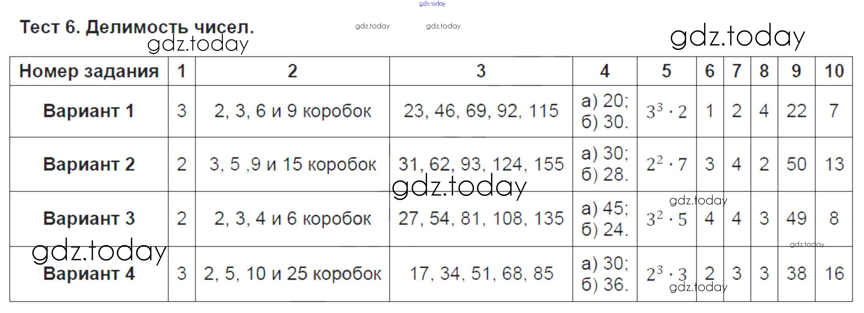 Ответы к Решение к тестам Тест №6. Делимость чисел Тематическим тестам по Математике для 5 класса Кузнецова, Минаева Просвещение 2018