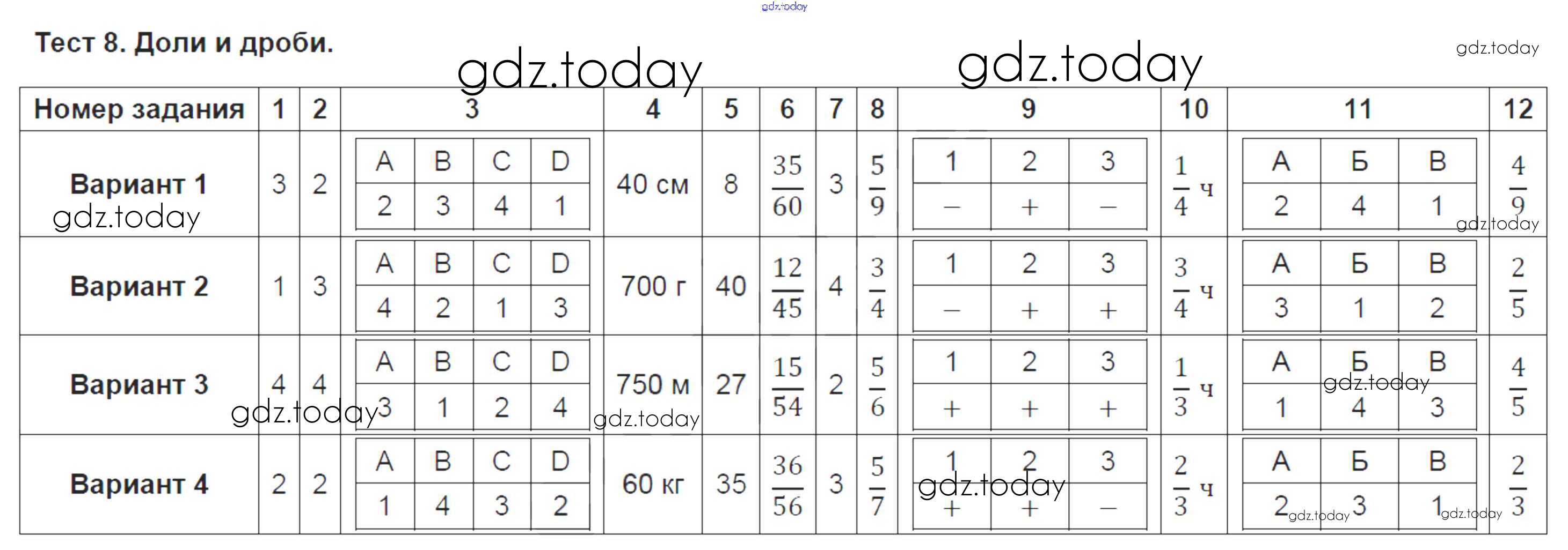 Ответы к Решение к тестам Тест №8. Доли и дроби Тематическим тестам по Математике для 5 класса Кузнецова, Минаева Просвещение 2018