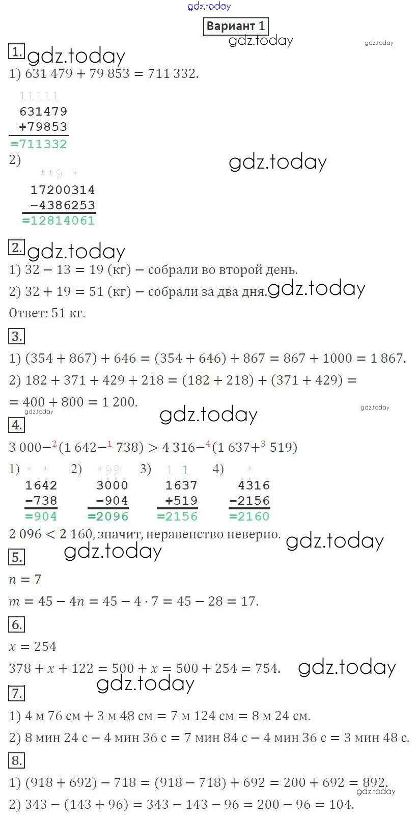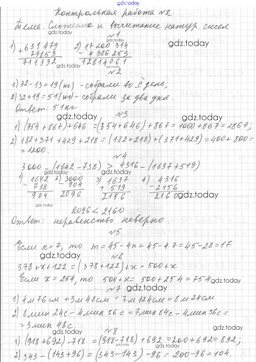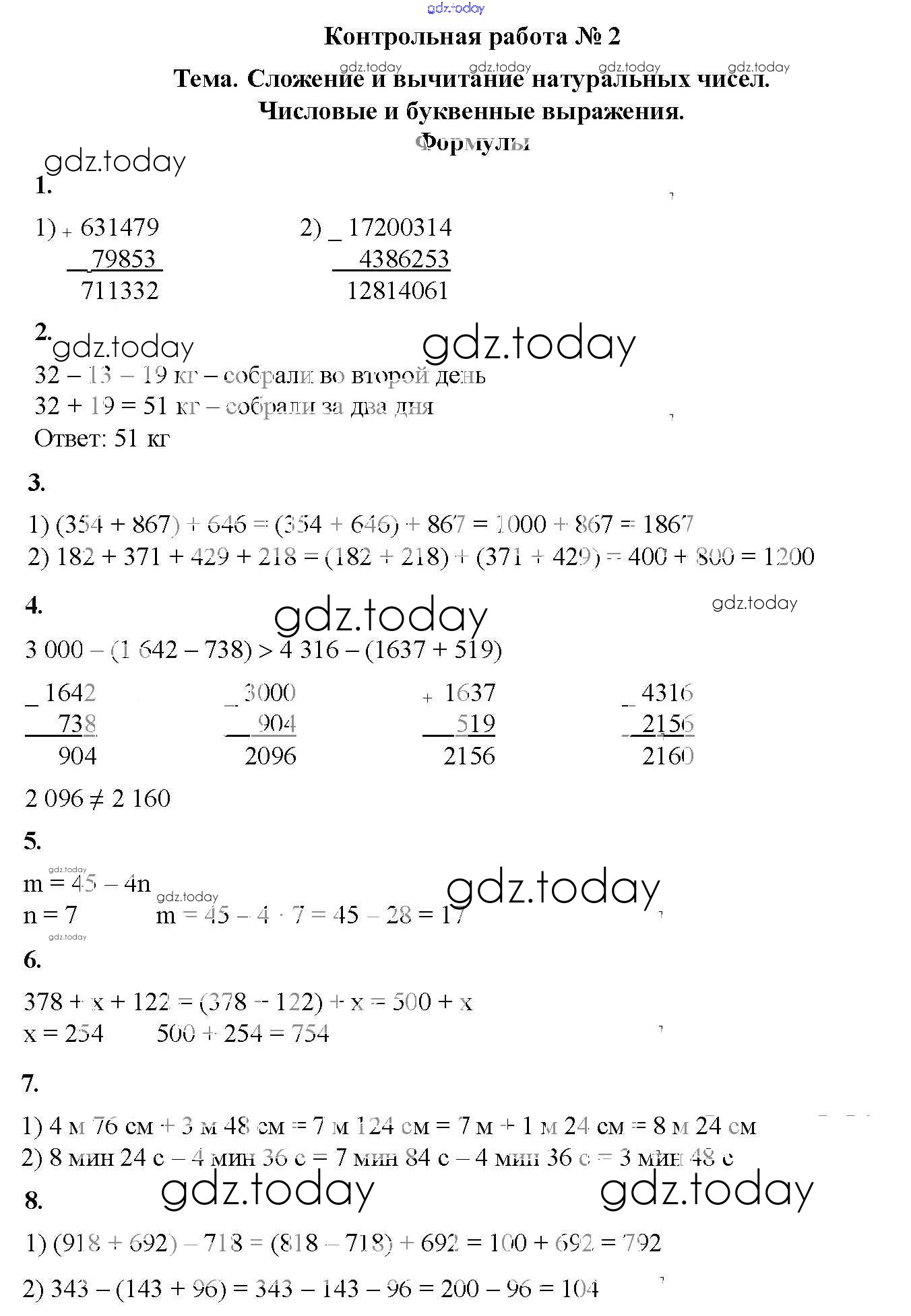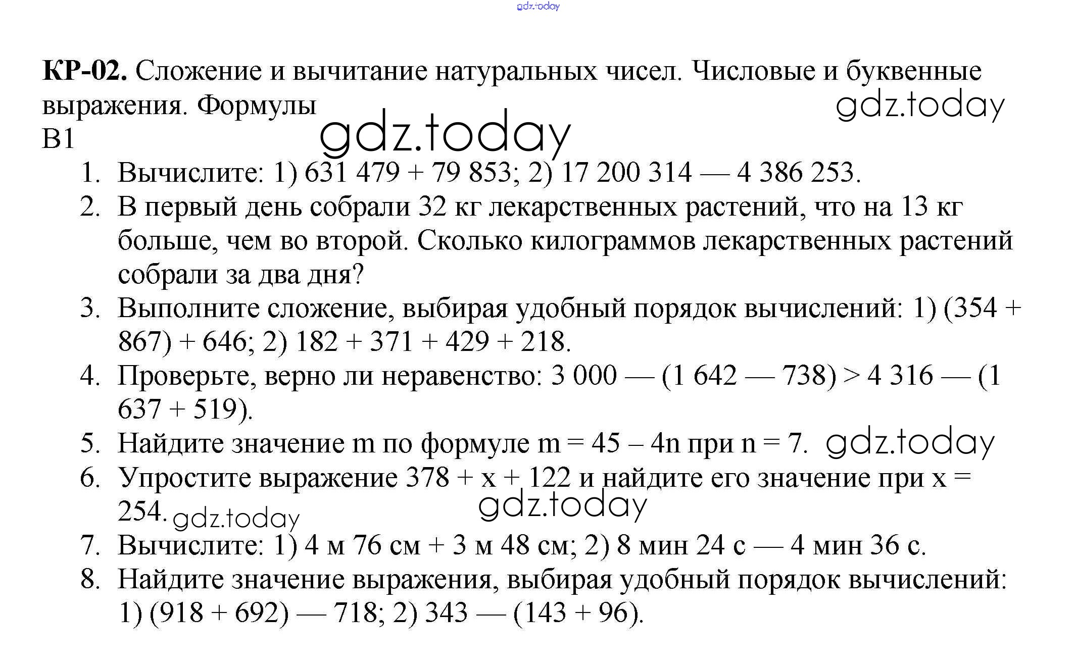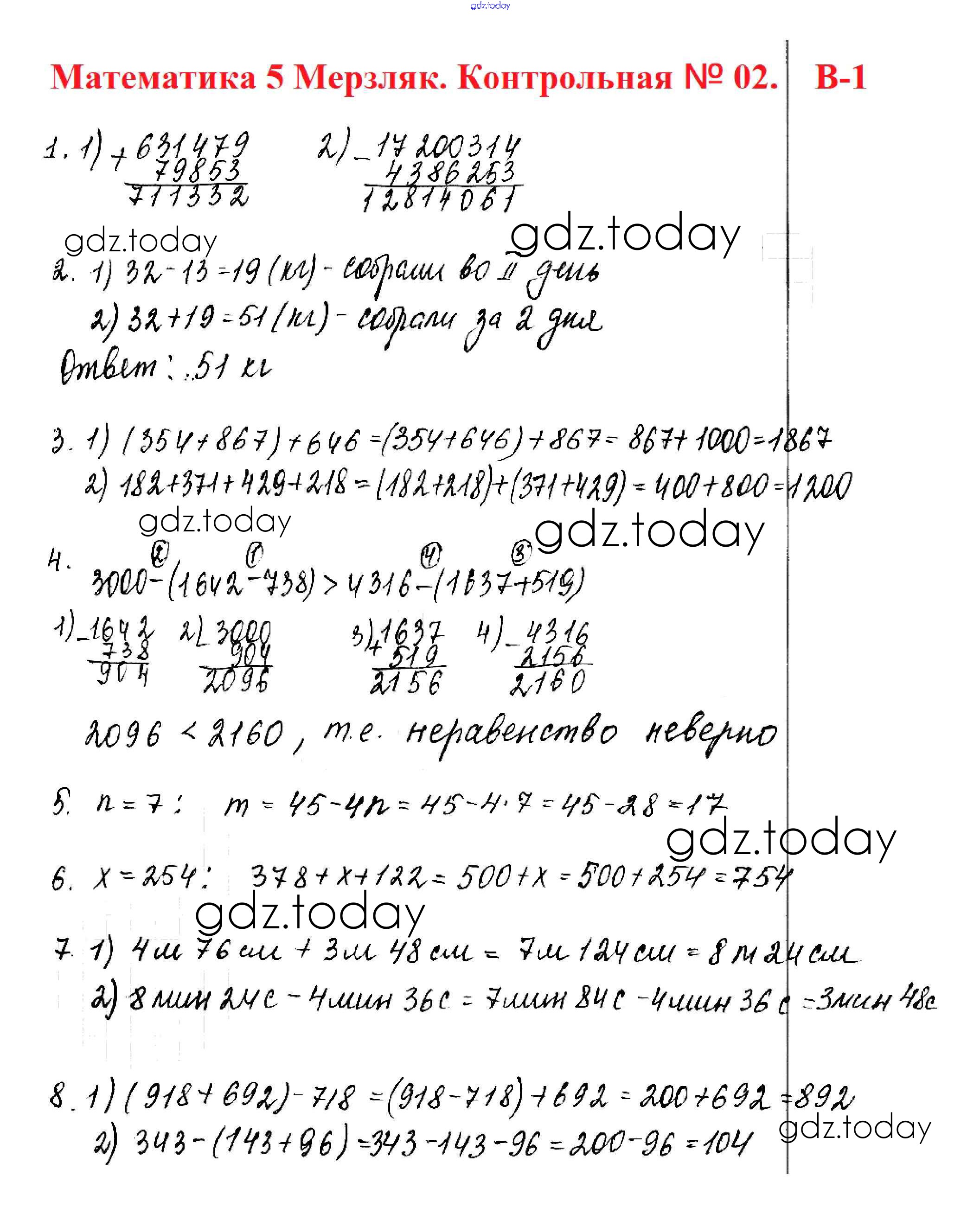 Ответы к КР №2. Сложение и вычитание натуральных чисел. Числовые и буквенные выражения. Числа Решение к контрольные работам вариант 1 Дидактическим материалам по Математике для 5 класса Мерзляк, Полонский Вентана-граф Алгоритм успеха 2017