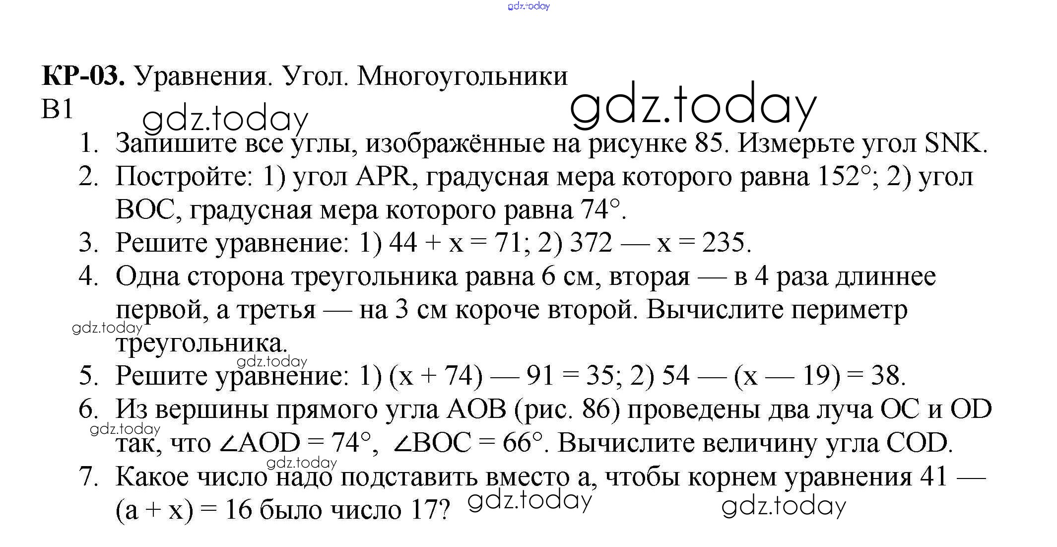 На страницах сайта gdz.today вы найдете учебный и вспомогательный материал, направленный на улучшения знаний школьной программы. ГДЗ - онлайн мир знаний КР №3. Уравнение. Угол. Многоугольники Решение к контрольные работам вариант 1 Дидактическим материалам по Математике для 5 класса Мерзляк, Полонский Вентана-граф Алгоритм успеха 2017